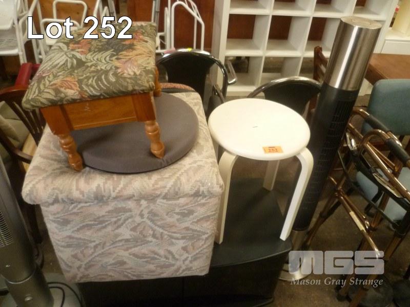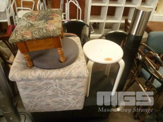 BLACK ENTERTAINMENT UNIT, WHITE STOOL, TAPESTRY FOOTREST, FABRIC OTTOMAN & VERTICAL HEATER