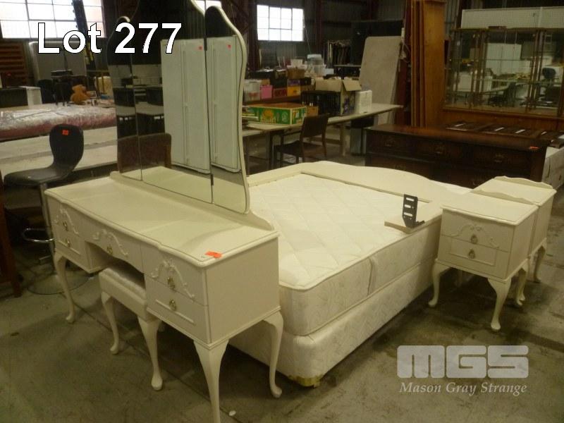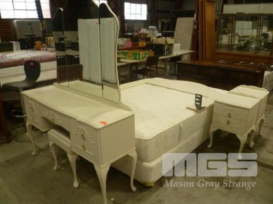 WHITE PAINTED TIMBER QUEEN ANNE STYLE 6 PIECE BEDROOM SUITE INC QUEEN SIZE ENSEMBLE, DRESSER, WING BACK MIRRORS, 5 DRAWER, STOOL, BEDHEAD & PAIR BEDSIDE CABINETS