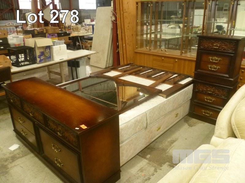 TIMBER VENEER 5 PIECE BEDROOM SUITE, BRAS HANDLES, ORNATE CARVING INC QUEEN SIZE ENSEMBLE WITH UNDERSTORAGE, 7 DRAWER DRESSER, BEDHEAD & PAIR BEDSIDE CABINETS