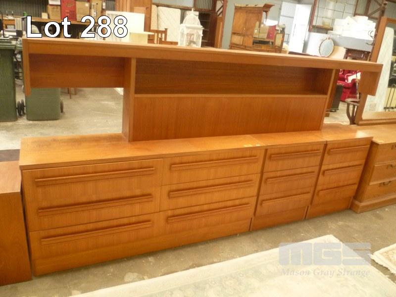 TEAK 4 PIECE BEDROOM SUITE INC PAIR BEDSIDE CABINET, 6 DRAWER LOWLINE CHEST & QUEEN SIZE BEDHEAD