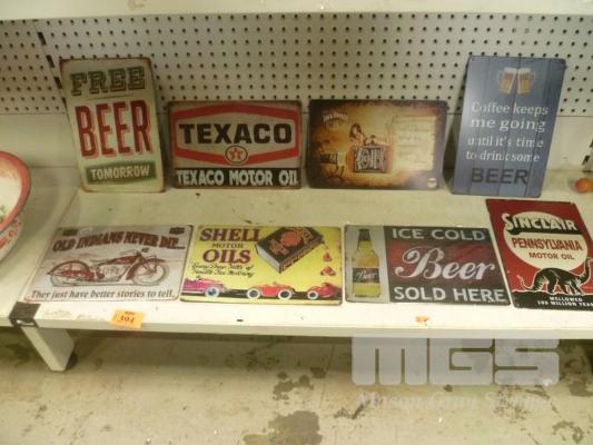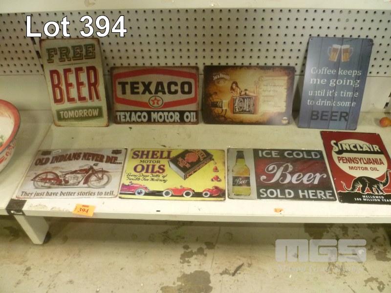 8 x REPRODUCTION TIN SIGNS, INC BEER, MOTORCYCLE, PETRONALIA, ETC