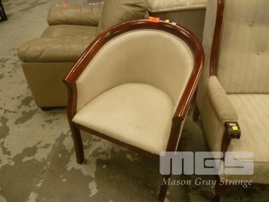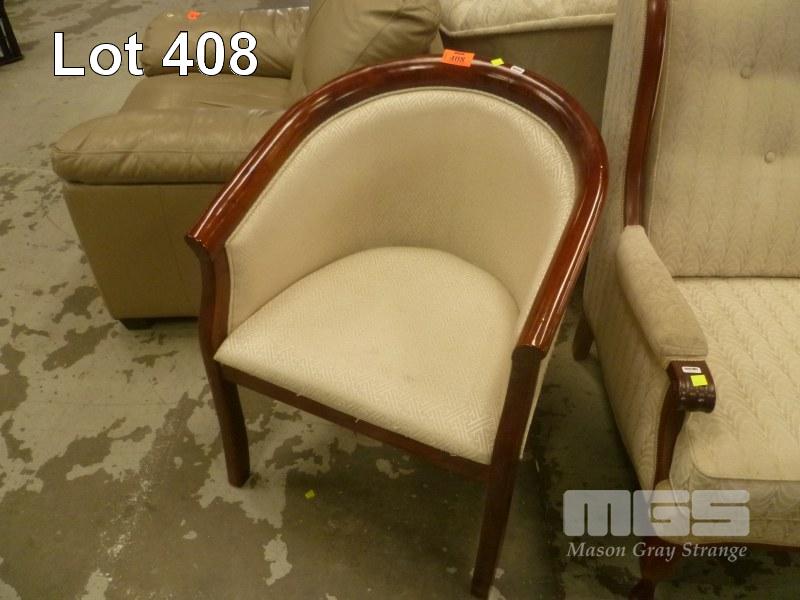 MAHOGANY FRAME TUB CHAIR, BEIGE FABRIC