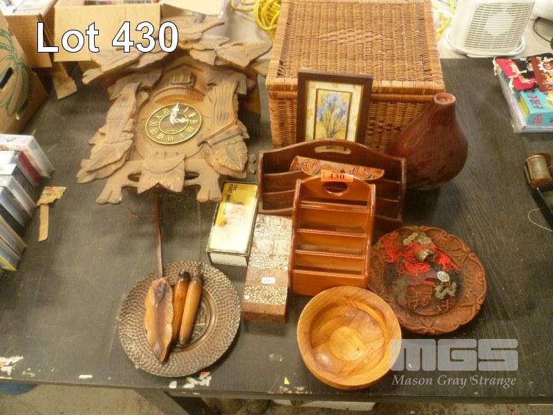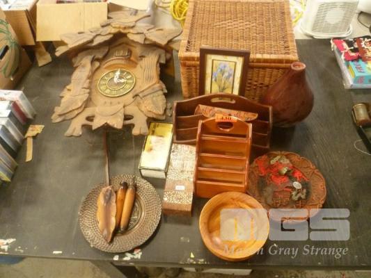 ASSORTED TREEN, RESIN CUCKOO CLOCK & COPPER PLATE