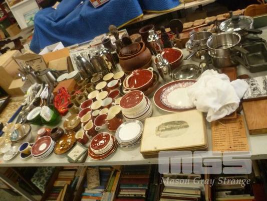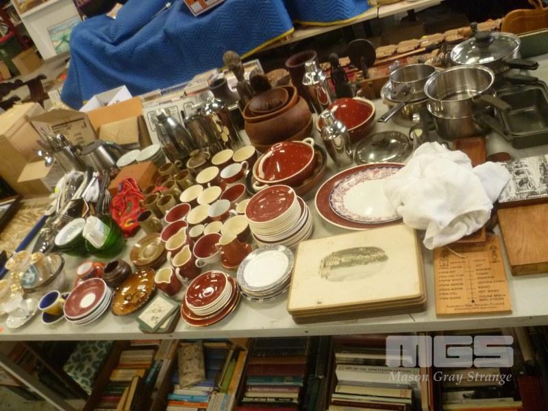 ASSORTED KITCHENWARE, UTENSILS, COOKWARE, DINNERWARE, ETC, 1 x TABLE