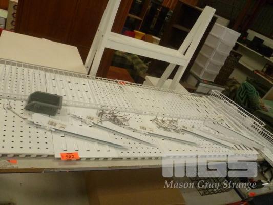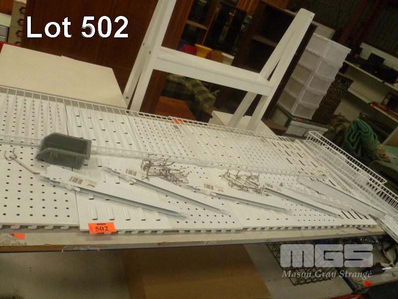 PEG BOARDS & ASSORTED ADJUSTABLE SHELVING & RACKS, HARDWARE & BUILDING MATERIALS