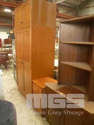 TIMBER CORNER SHELF UNIT WITH UNDERSTORAGE, PINE BEDSIDE CABINET & 2 PIECE WARDROBE