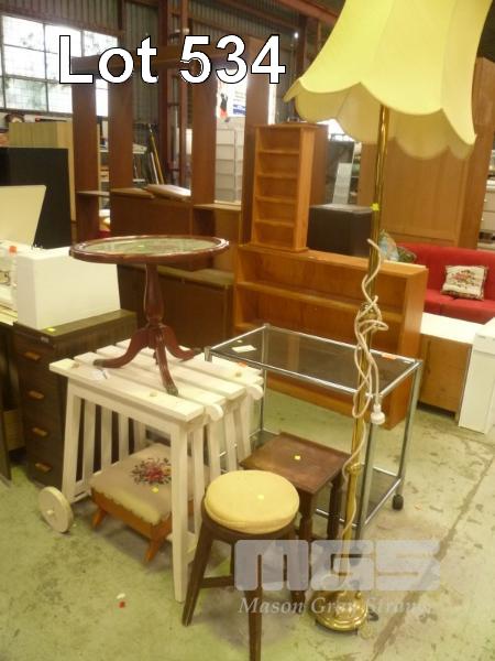 WHITE PAINTED TIMBER PLANT STAND, MAHOGANY WINE TABLE, TAPESTRY & GLASS INSERT, TAPESTRY FOOTREST, 2 x TIMBER SHORT STOOLS & BRASS STANDARD LAMP