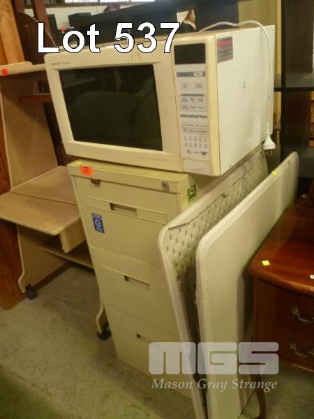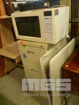 BEIGE METAL 3 DRAWER FILING CABINET, (NO KEY), SHARP CAROUSEL MICROWAVE & FOLD UP TRESTLE TABLE