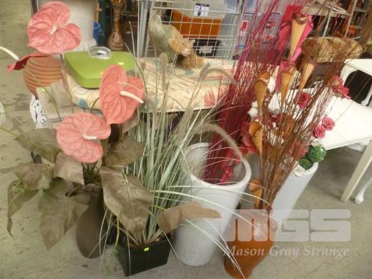 LARGE FLOOR VASES, ARTIFICIAL FLOWERS/PLANTS, IRONING BOARD, CLOTHES AIRER, ETC