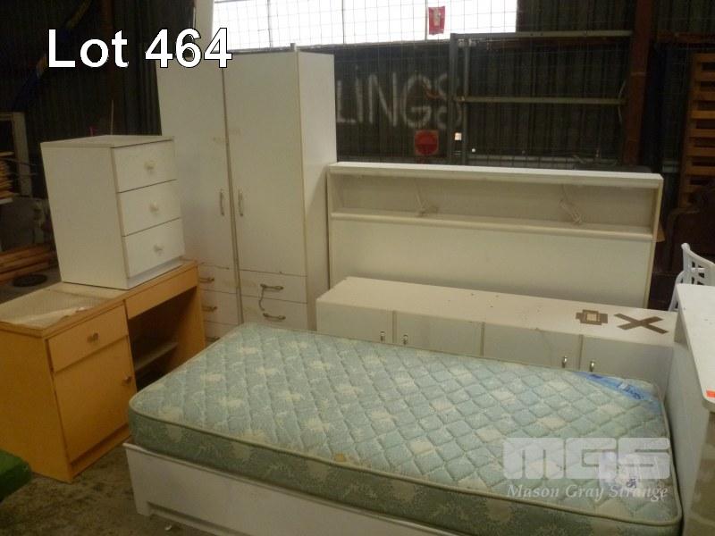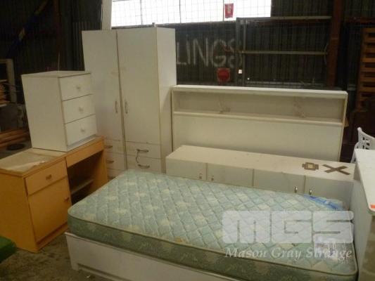 WHITE LAMINATE BEDROOM SUITE INC SINGLE BED WITH MATTRESS, BEDSIDE CABINET, 3 PIPECE WARDROBE WITH UNDERSTORAGE, BED HEAD & STUDENTS DESK