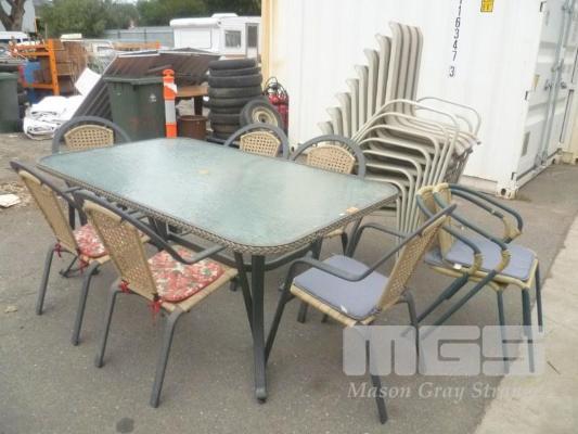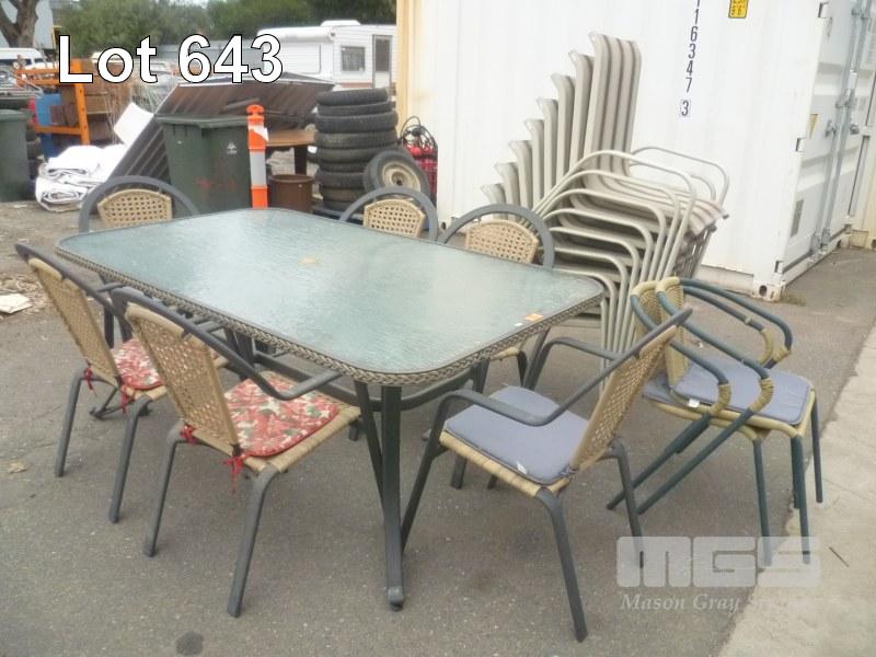 GREEN, ALUMINIUM FRAME, 7 PIECE OUTDOOR SETTING INC RECTANGULAR GLASS TOP TABLE & 6 x ARM CHAIRS, PLASTIC WEAVE WITH SET 8 BEIGE OUTDOOR ARM CHAIRS & SET 2 GREEN OUTDOOR ARM CHAIRS