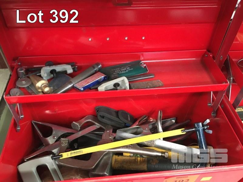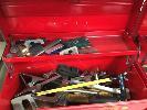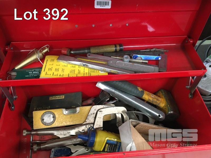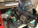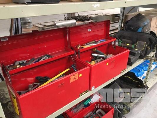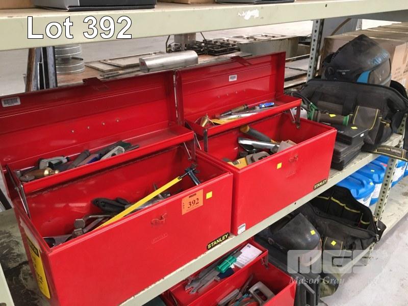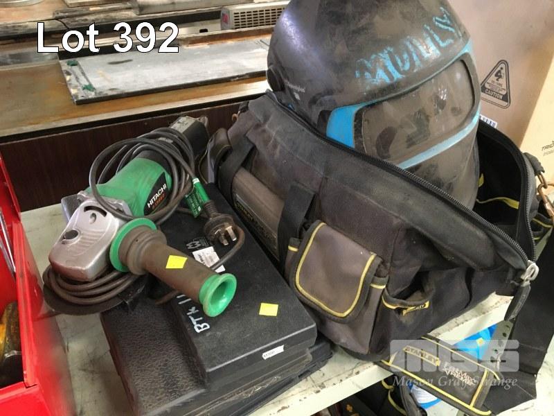 2 x TOOL BOXES & ASSORTED HAND TOOLS, HITACHI ANGLE GRINDER, DRIVER SETS & 2 x WELDING HELMETS