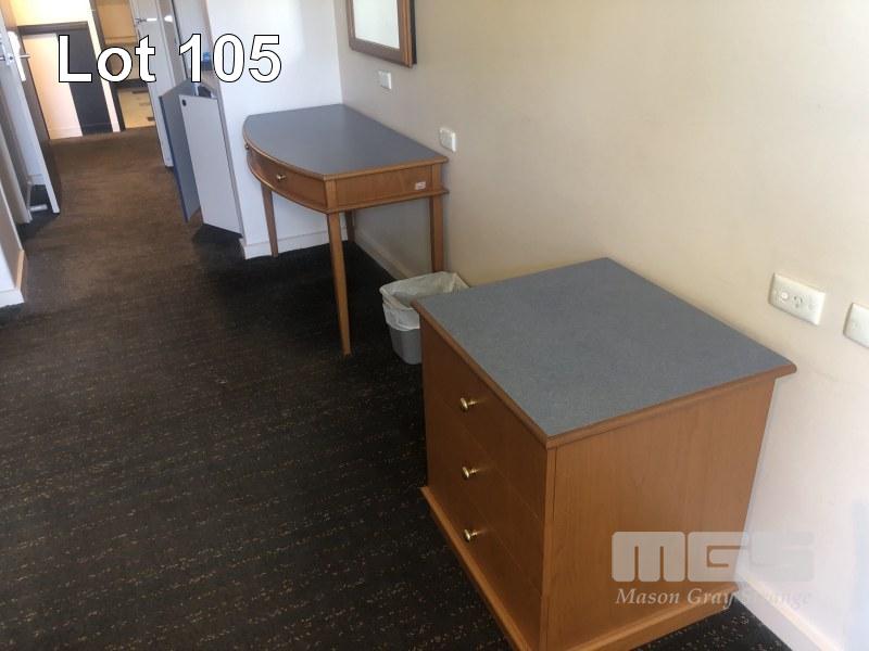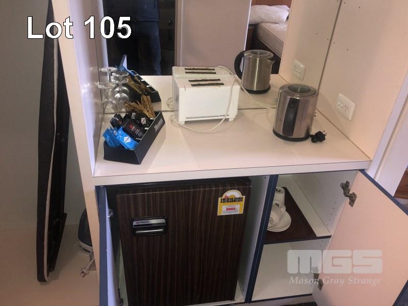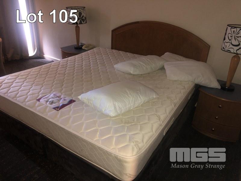 CONTENTS OF ROOM, KING SIZE ENSEMBLE (NOTE: 2 x SINGLE SIZE BED BASES) , 2 x CLOTH CHAIRS, BAR FRIDGE, COFFEE TABLE, WALL MOUNT MIRROR, PEDESTAL LAMP, FOLDING LUGGAGE RACK, CURVED FRONT TIMBER DESK & MATCHING 3 DRAWER CHEST, IRONING BOARD