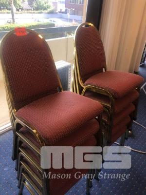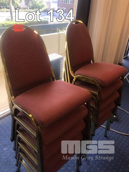 10 x STEEL FRAME DINING CHAIRS, RED PATTERN CLOTH, GOLD FRAME
