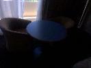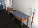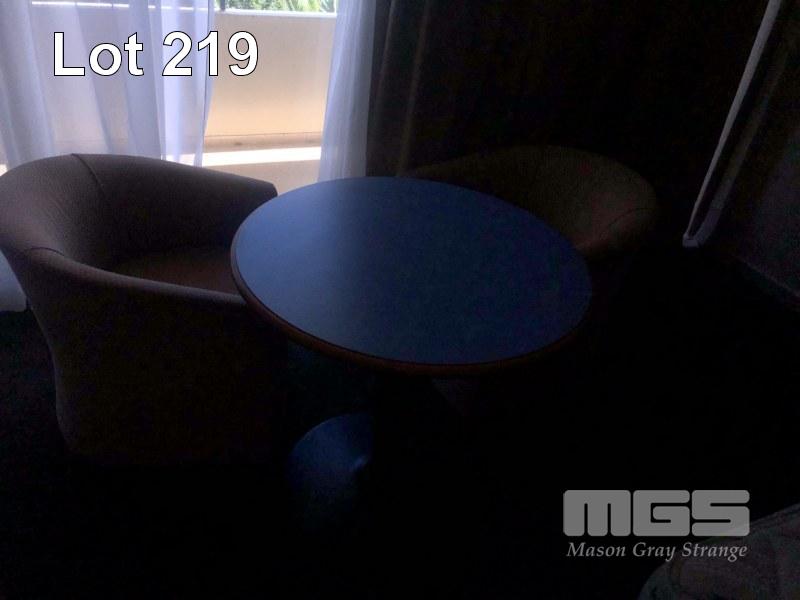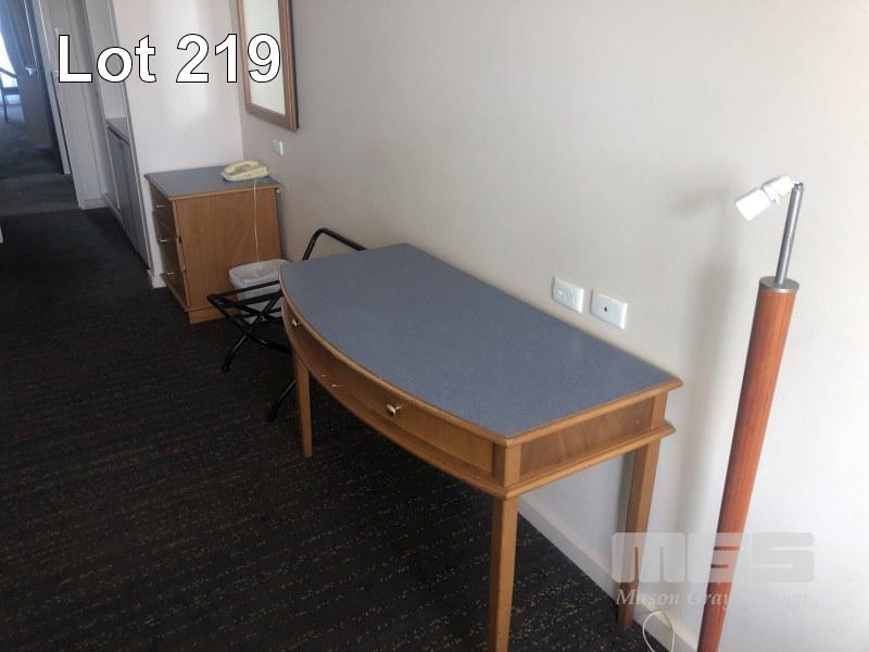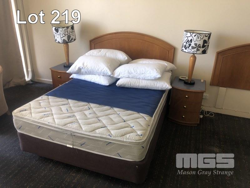 CONTENTS OF ROOM, QUEEN SIZE ENSEMBLE, BAR FRIDGE, 2 x CLOTH CHAIRS, COFFEE TABLE, WALL MOUNT MIRROR, 1 x CURVED FRONT TIMBER DESK & MATCHING 3 DRAWER CHEST, IRONING BOARD, BEDSIDE CABINET