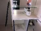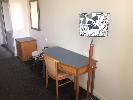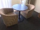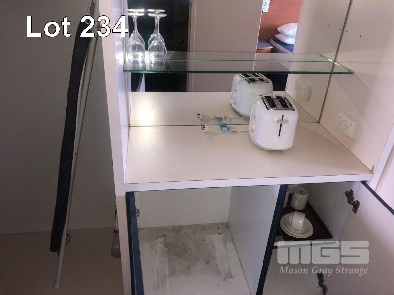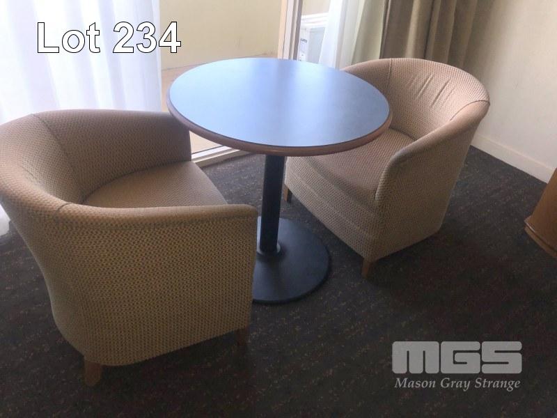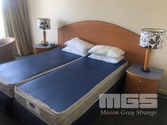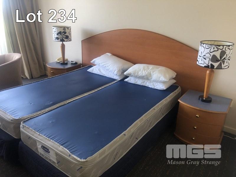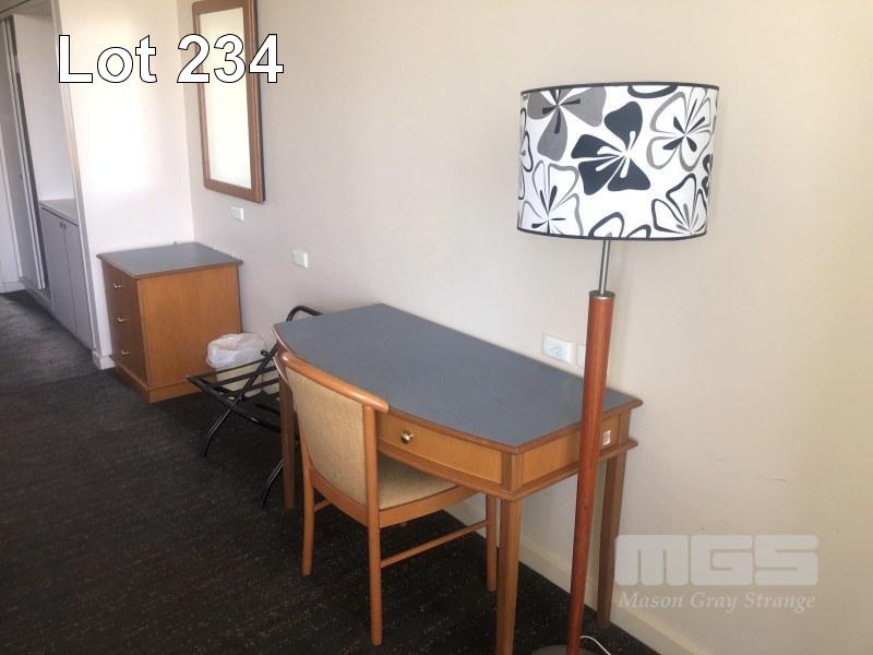 CONTENTS OF ROOM, 2 x SINGLE SIZE ENSEMBLES, 3 x CLOTH CHAIRS, COFFEE TABLE, PEDESTAL LAMP, WALL MOUNT MIRROR, 1 x CURVED FRONT TIMBER DESK & MATCHING 3 DRAWER CHEST, IRONING BOARD, BEDSIDE CABINET