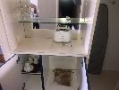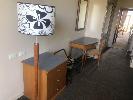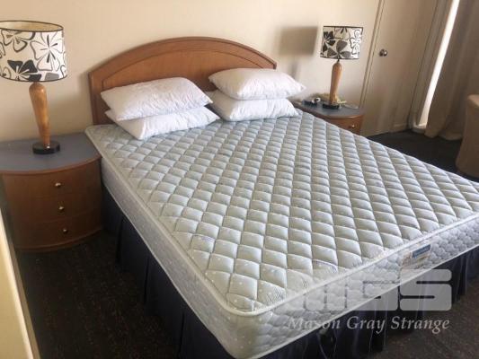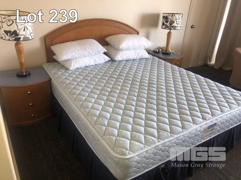 CONTENTS OF ROOM, KING SIZE ENSEMBLE, 3 x CLOTH CHAIRS, COFFEE TABLE, PEDESTAL LAMP, WALL MOUNT MIRROR, 1 x CURVED FRONT TIMBER DESK & MATCHING 3 DRAWER CHEST, IRONING BOARD, BEDSIDE CABINET
