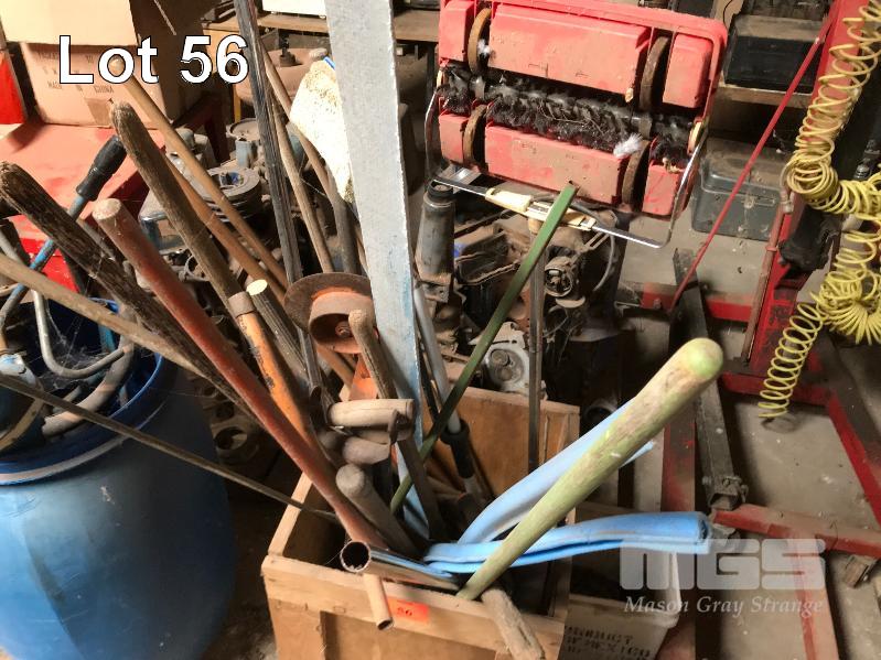 TIMBER CRATE & CONTENTS GARDEN HAND TOOLS, CLEANING & PLASTIC TUBE OF CHAIN