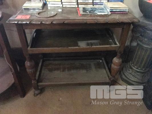 ANTIQUE TRAY MOBILE, 3 TIER WITH REMOVABLE TRAY SECOND TIER, PIE CRUST EDGE, 4 WHEEL