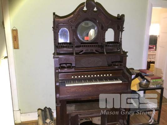 CARVED TIMBER BELLOWS ORGAN, ESTRY ORGAN CO, BRATTLEBORO, USA & MIRROR BACKED OVERSHELF, 1 x MIRROR MISSING, 1 x STOOL