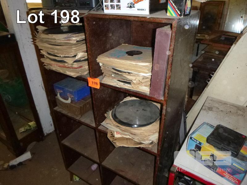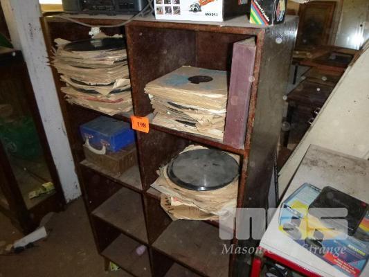 TIMBER 8 SECTION RECORD STORAGE CABINET & CONTENTS GRAMOPHONE RECORDS & CASSETTES