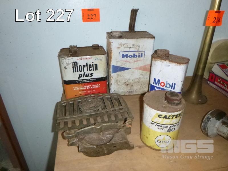 ASSORTED OIL TINS, RUGBY BRAND GRATES, PUNCTURE REPAIR PRESS, ETC