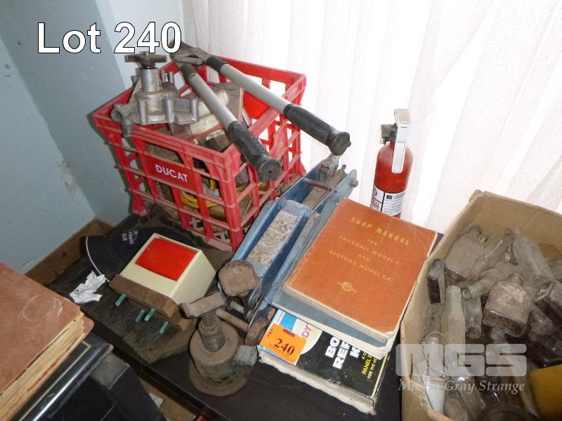 ASSORTED AUTOMOTIVE, BODY REPAIR KIT, WORKSHOP MANUALS, HYDRAULIC GARAGE JACK, ETC
