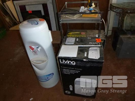 LIVING ESSENTIALS EVAPORATIVE COOLER, STAINLESS STEEL TROLLEY, HOT/COLD WATER DISPENSER & NEST TABLES