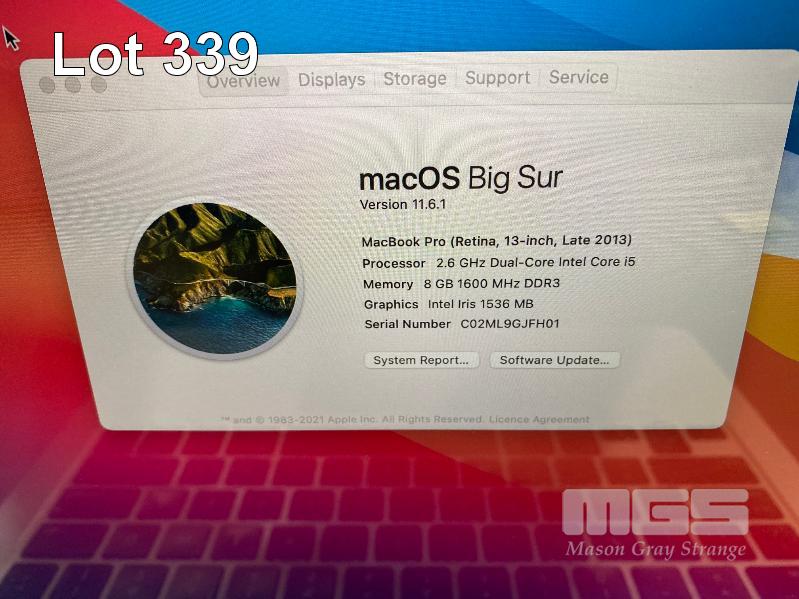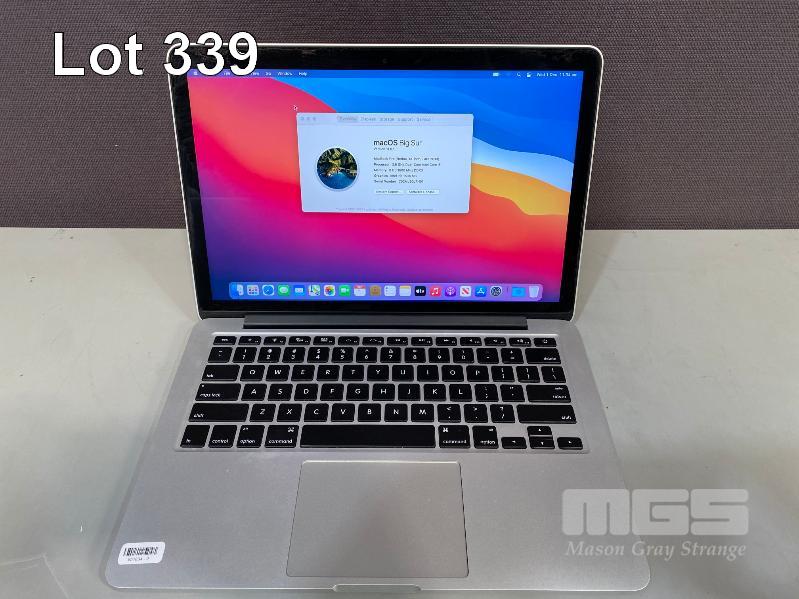 LAPTOP, APPLE MACBOOK PRO (A1502), CORE i5 4288U (4TH GEN) @ 2.6GHz, 8GB DDR3 RAM, 512GB SSD, 13.3" RETINA WIDESCREEN (2560x1600), INTEL IRIS GRAPHICS, Wi-Fi, MAC OS 11.6 INSTALLED (NO POWER SUPPLY ) (NOTE: MAJOR MARKS ON SCREEN) S/N:C02ML9GJFH01