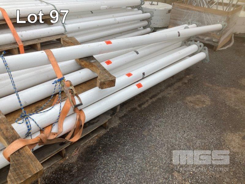 4 x RELOCATABLE FLAG POLES, FORMENTA, 8.9m FIBREGLASS CONSTRUCTION, TILTING HINGE BASE (NO PINS) MOUNTED ON CONCRETE BLOCK (DISMANTLED)
