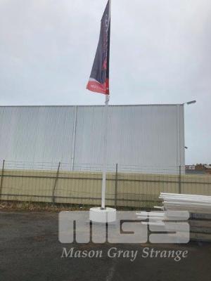 4 x RELOCATABLE FLAG POLES, FORMENTA, 8.9m FIBREGLASS CONSTRUCTION, TILTING HINGE BASE (NO PINS) MOUNTED ON CONCRETE BLOCK (DISMANTLED)