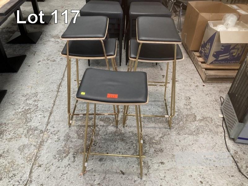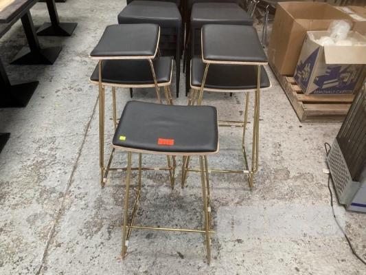 5 x BAR STOOLS, BLACK VINYL SEAT, GOLD CHROME FRAME
