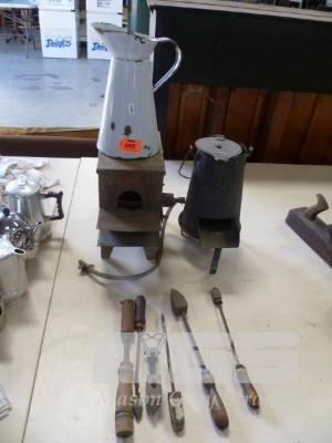 SMALL VINTAGE GAS KILN WITH VINTAGE TOOLS , POT KILN & ENAMEL JUG