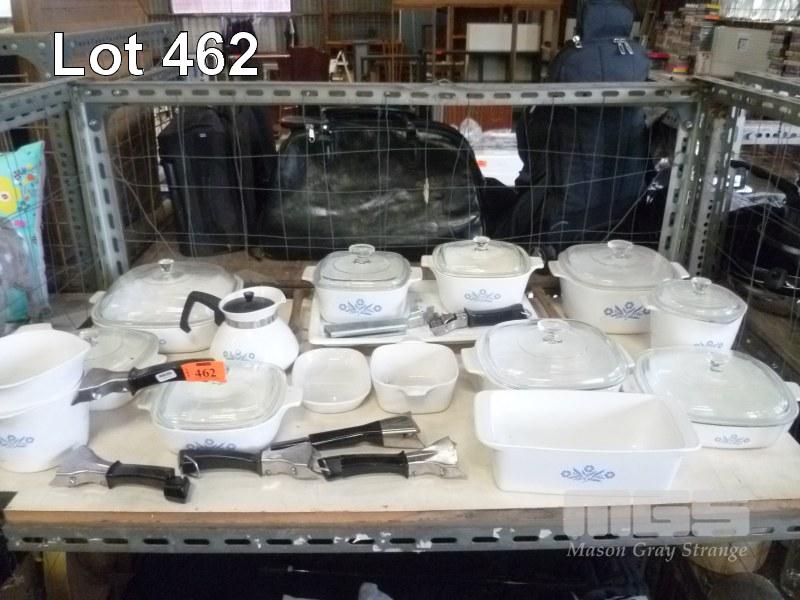 CORNINGWARE COLLECTION, BLUE & WHITE WITH DETACHABLE HANDLES