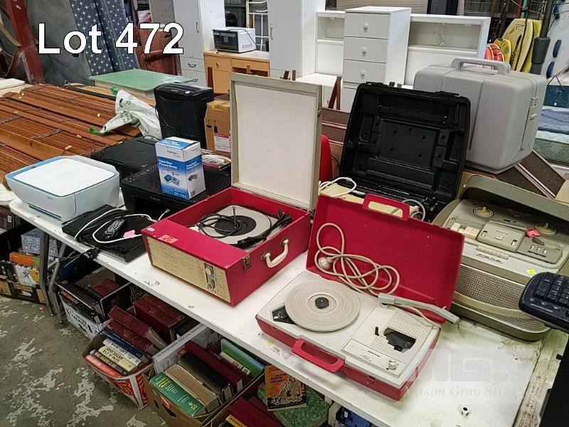 ASSORTED PRINTERS, BROTHER TYPEWRITER, PORTABLE PHONOGRAPHS, REEL TO REEL PLAYER, ANALOGUE TV, ETC, 1 x TABLE
