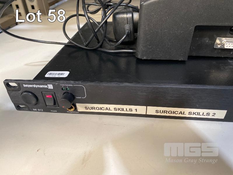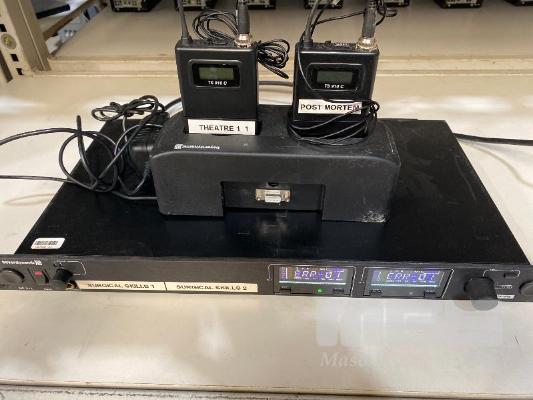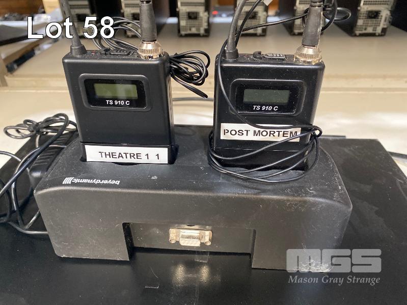 BEYERDYNAMIC NE 912 2-CHANNEL WIRELESS AUDIO RECEIVER (574-646MHz) WITH 2 x TS910C BELTPACK TRANSMITTERS & LAPEL MICROPHONES WITH CHARGING DOCK (NOTE: DISPLAY SHOWING "ERR-01") S/N:868304745A