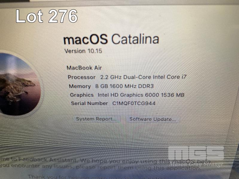 LAPTOP, APPLE MACBOOK AIR (A1466), CORE i7 5650U (5TH GEN) @ 2.2GHz, 8GB DDR3 RAM, 512GB SSD, 13.3" WIDESCREEN (1440x900), INTEL HD VIDEO, Wi-Fi, MAC OS 10.15 INSTALLED & POWER SUPPLY S/N:V1MQF0TCG944