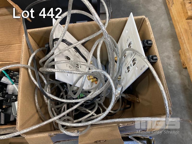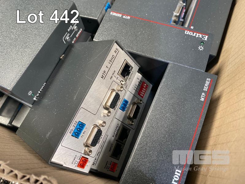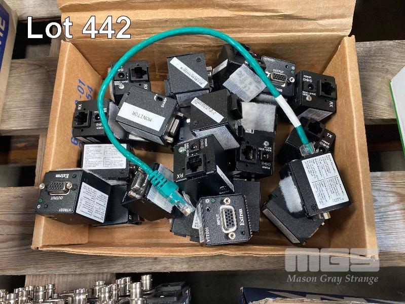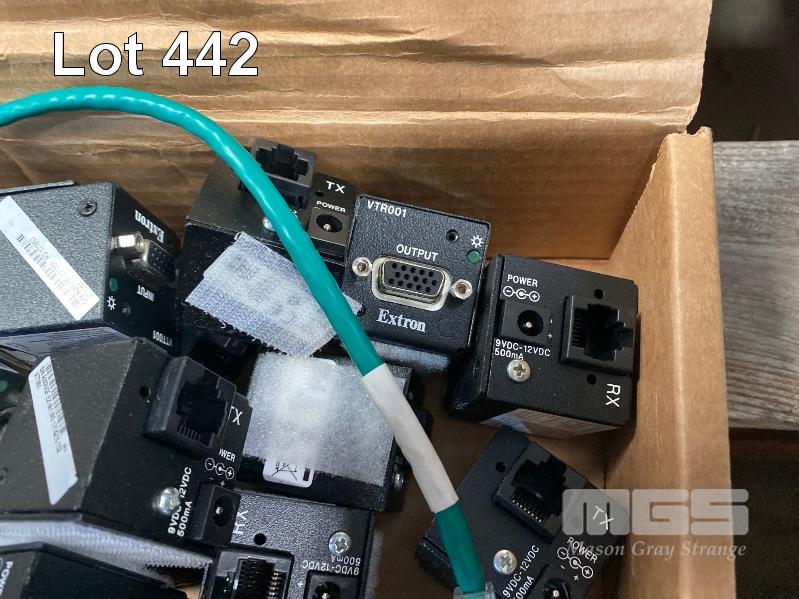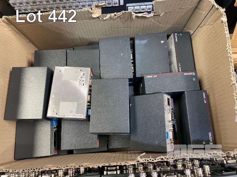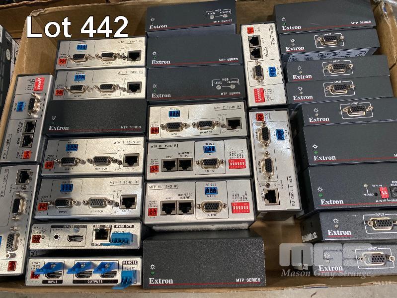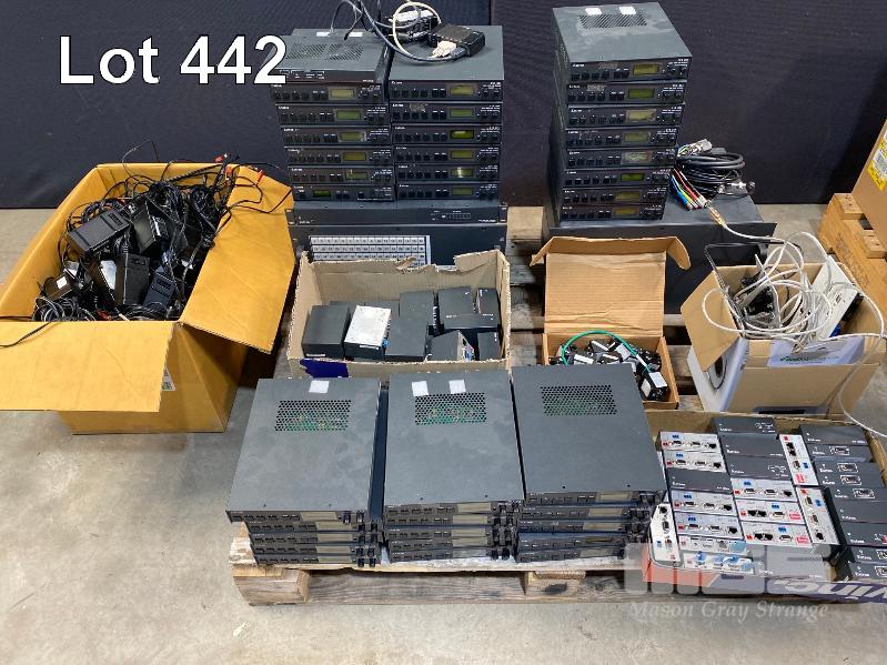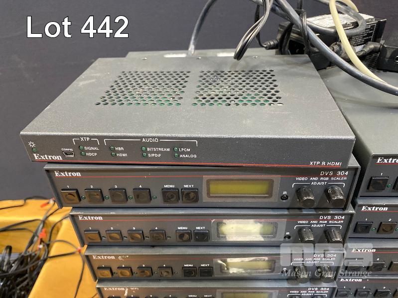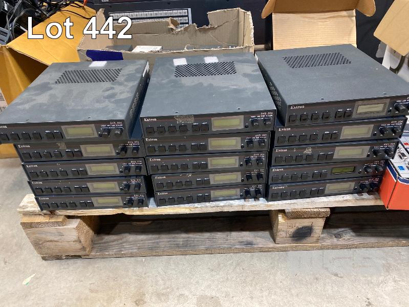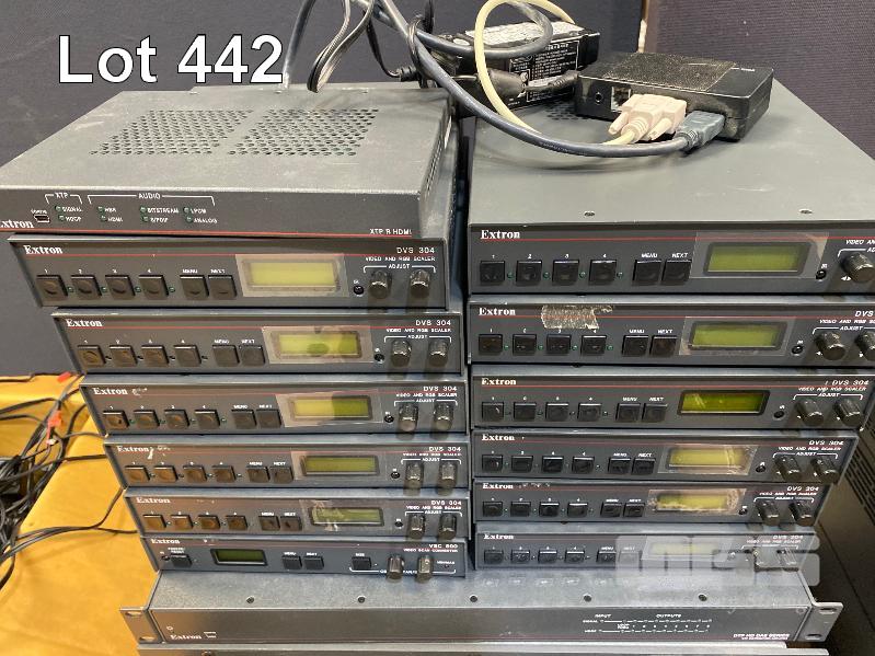 PALLET LOT EXTRON AUDIO EQUIPMENT INCLUDING 2 x EXTRON CROSSPOINT 450 PLUS SERIES SWITCHERS, 34 x EXTRON DVS304 VIDEO SCALERS, 1 x VSC 500 VIDEO SCAN CONVERTER, 1 x EXTRON XTP R HDMI TRANSMITTER, 2 x BOXES OF EXTRON MTP T 15HD RS & MTP RL 15HD RS TRANSMITTER/RECEIVERS, 1 x BOX OF EXTRON VTR001 ADAPTERS, 2 x WALL PLATES, 1 x BOX EXTRON POWER SUPPLIES, (NO CABLES)