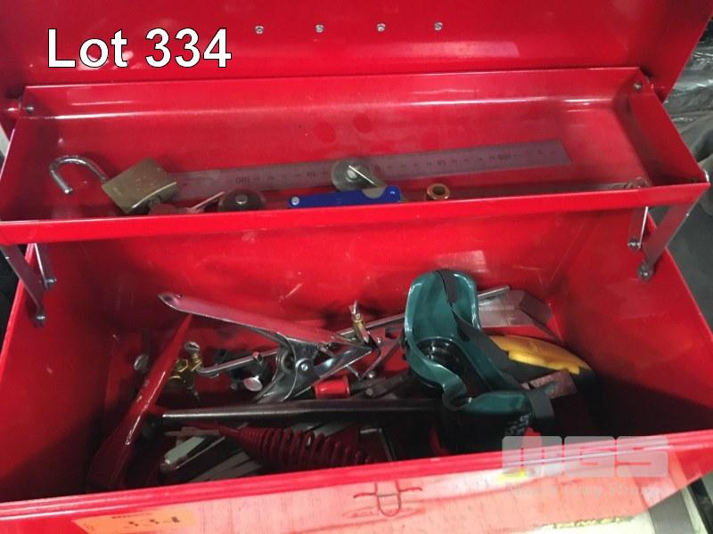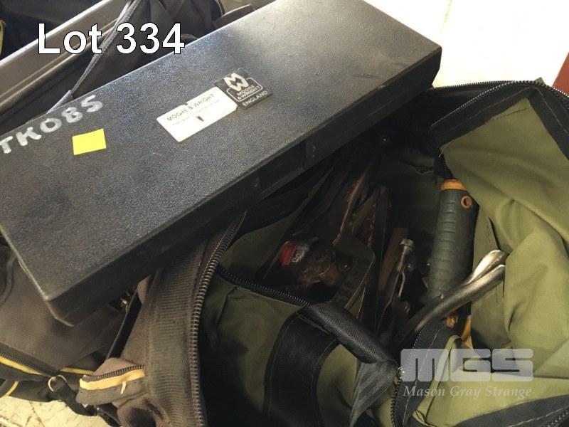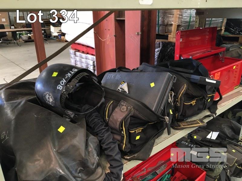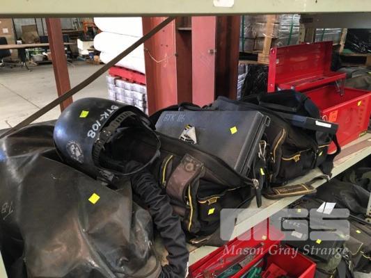 ASSORTED STANLEY TOOL BAGS & BOX INC SCREWDRIVER SET, CLAMPS, PRECISION COMBINATION SET, ETC WITH POSITIVE FEED WELDING KIT, NO BATTERY OR CHARGER, 1 x SHELF