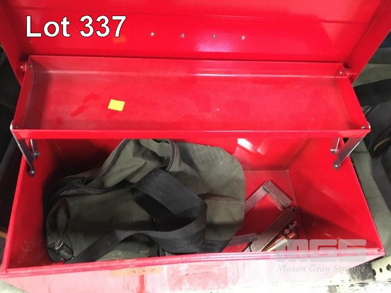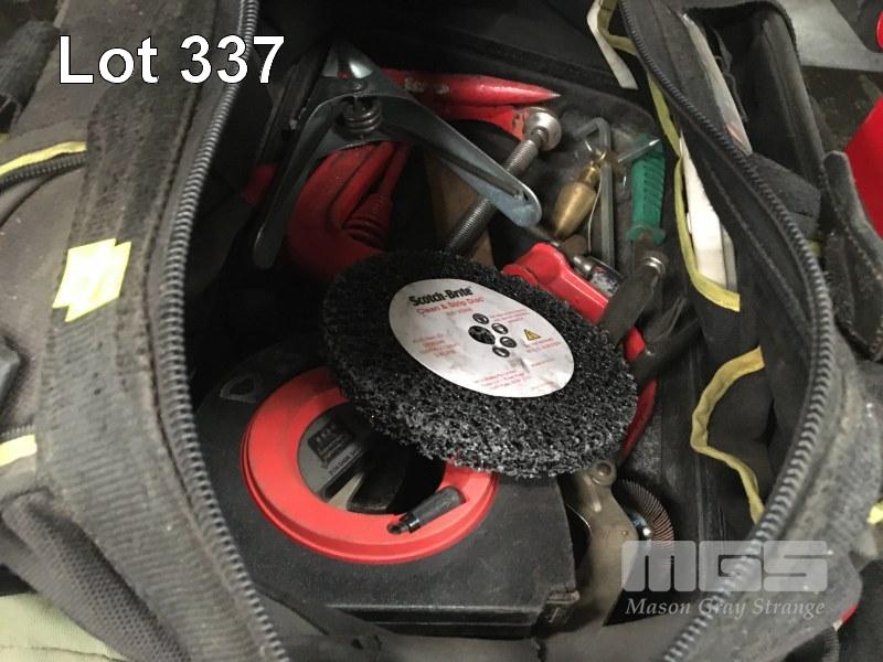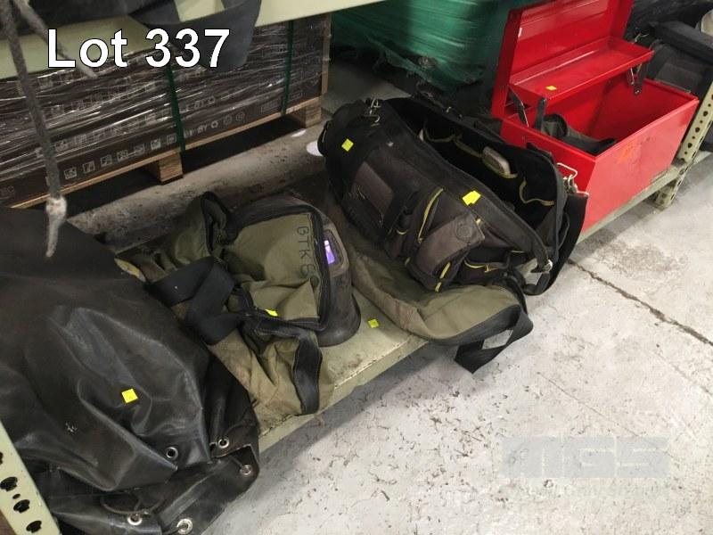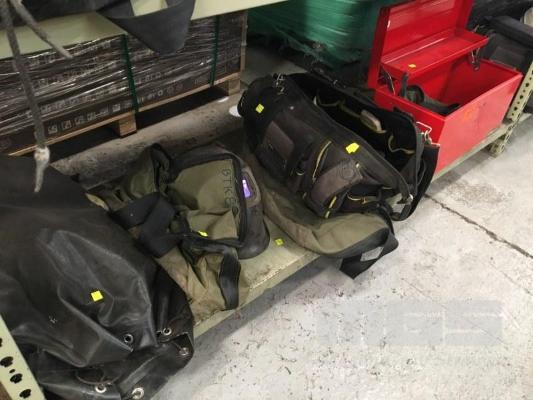 3 x STANLEY TOOL BAGS & BOX INC, VICE GRIPS, CLAMPS, STRIP DISC, POSITIVE FEED WELDING KIT, BATTERY & CHARGER 1 x SHELF