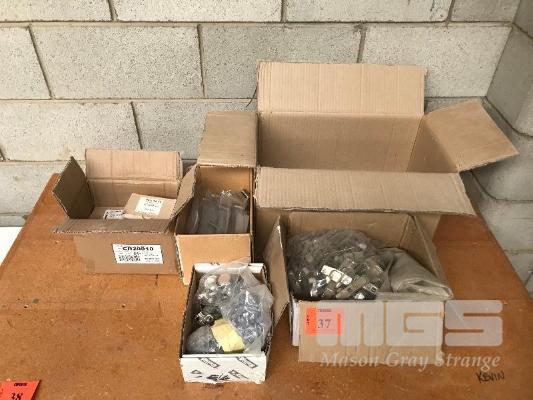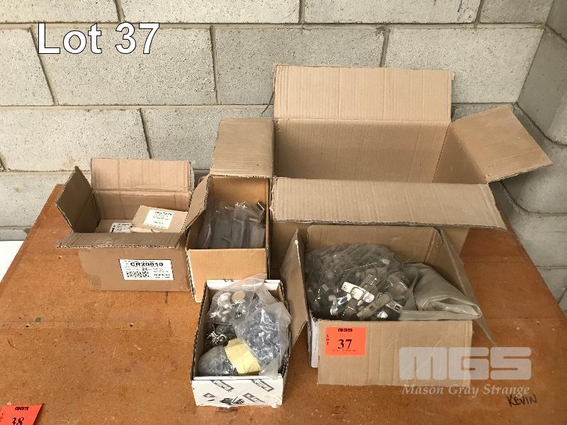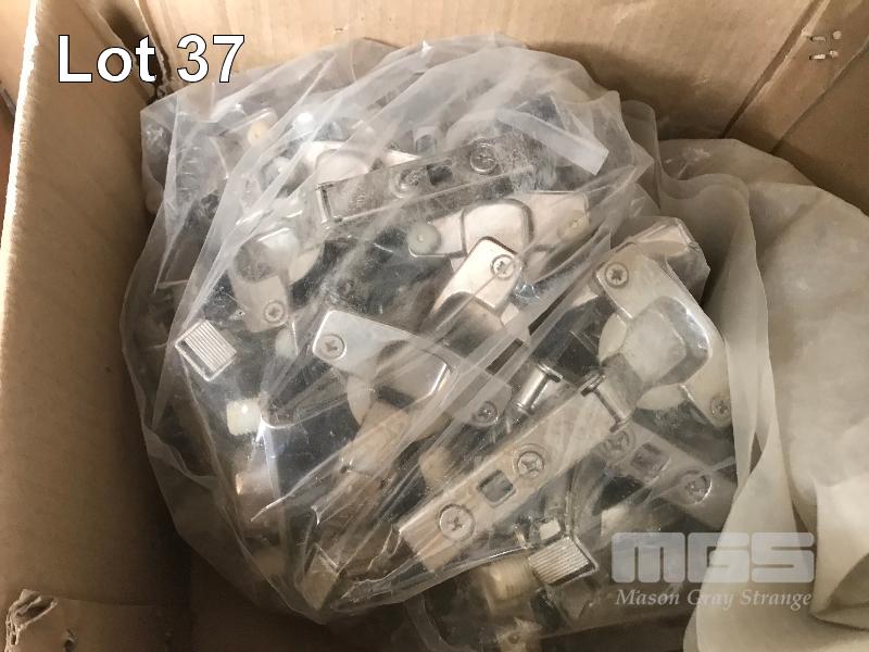 ASSORTED FURNITURE, HARDWARE & FASTENERS, DRAWER RUNNERS, HINGES, HANDLES, BOOKCASE SHELF, PLUGS, FLATHEAD SCREWS ETC (5 x BOXES)