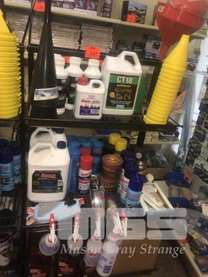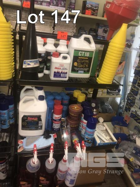 THE LUBE LOT, INOX, GREASES, LANOLIN, SPRAYS, 4 LITRE PACKS, PASTES & CT18 SUPER WASH, MARVEL OF MYSTERY OILS, FUNNELS, ETC, CONTENTS OF RACK
