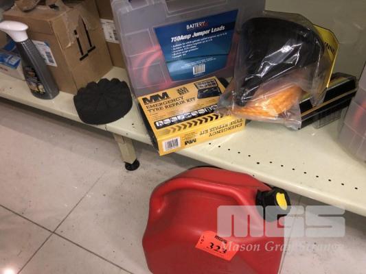 CAR KIT, 750AMP JUMPER LEADS, BATTERY CHARGER, TOW ROPE, FUNNEL & TYRE REPAIR KIT WITH FUEL CAN