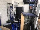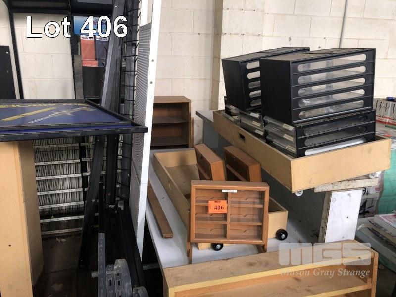 ASSORTED SHOP DISPLAY RACKS & RANDLES, DISPLAY SIGNS, PLASTIC PARTS, SHELVES & DESK