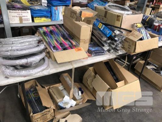 CONTENTS OF TABLE, MIRROR PROTECTORS, STEERING WHEEL COVERS, NEON LIGHTS, WIPER BLADES, 36 x PLASTIC FUNNELS ETC.