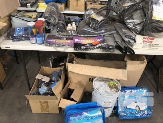 CONTENTS OF TABLE, MECHANIC SEAT COVERS, CAR BLANKETS, CAR COVER, BACK SUPPORTS, ZIP TIES, MOREY'S BIG FOOT GREASE ETC.