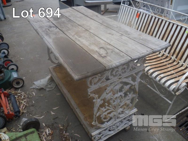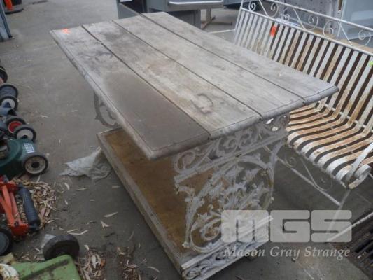 OUTDOOR TABLE, CAST IRON LEGS, SOLD TIMBER TOP