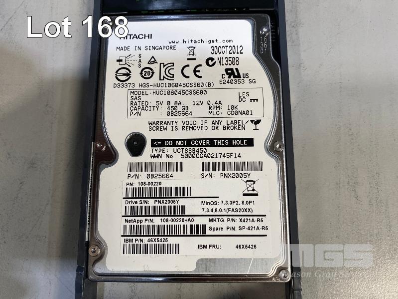 RACKMOUNT STORAGE ARRAY, NETAPP DS2246 NAJ-1001, 2U, 24 x 450GB SAS HDD, 2 x SAS STORAGE CONTROLLERS (IOM6), 2 x 750W PSU WITH RAILS & QSFP CABLES S/N:850000224300