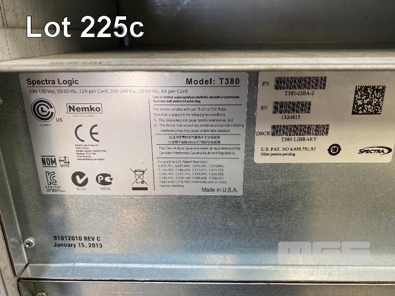 TAPE LIBRARY, SPECTRA LOGIC T380 WITH 4 x LTO-6 FC TAPE DRIVES, 90949382 WITH RAILS (NO CABLES) OVERALL SIZE 124 x 44 x 90cm (NOTE: MISSING CABINET COVERS, LCD DISPLAY FAULTY) S/N:1324815