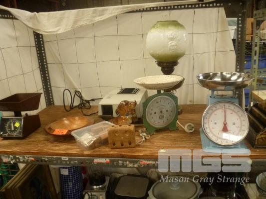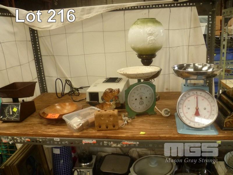ASSORTED COLLECTIBLES INCLUDING RETRO KITCHEN SCALES, TABLE LAMP, HANIMEX SLIDE PROJECTOR, DOG FIGURINE, WOODEN OBJECTS ETC